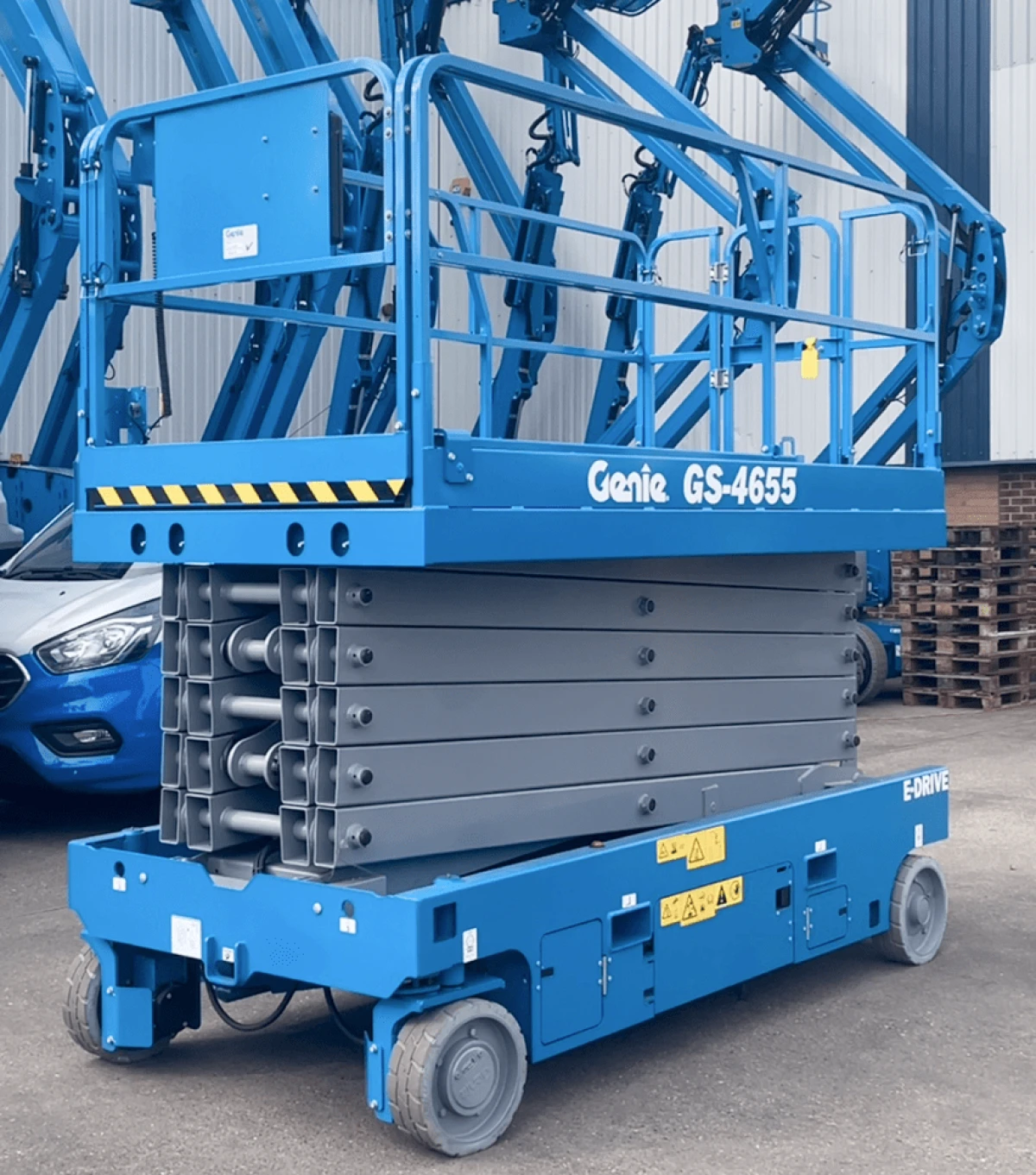 The Genie GS4655 E-Drive is a robust, eco-friendly electric scissor lift engineered for high indoor and outdoor access in restricted spaces. It offers operators an excellent combination of working height and lifting capacity capabilities with powerful electric drive motors. This scissor lift is just 1.41m wide, but has the ability to reach an 15.95m working height indoors, and 8.55m outdoors.